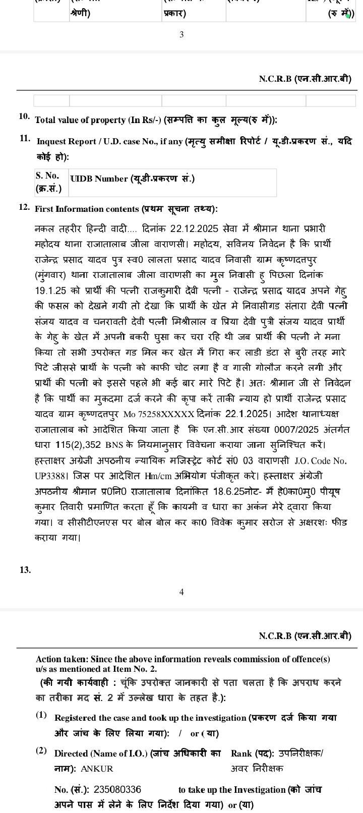 प्राप्त जानकारी के अनुसार पीड़ित राजेन्द्र प्रसाद यादव निवासी ग्राम कृष्णदत्तपुर (मुंगवार) थाना राजातालाब बीते 19 जनवरी 25 को पीड़ित की पत्नी राजकुमारी देवी अपने गेहु की फसल को देखने गयी तो देखा कि पीड़ित के खेल मे पता उपरोक्त की रहने वाली