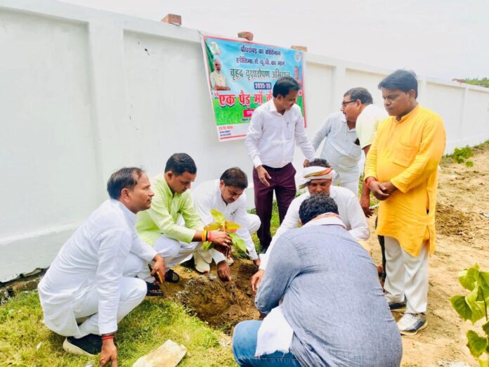 राजातालाब।आराजी लाइन विकासखंड क्षेत्र में खंड विकास अधिकारी सुरेंद्र सिंह यादव की उपस्थिति में एक पेड़ मां के नाम बृहद पौधारोपण अभियान के तहत बीरभानपुर स्थित कब्रिस्तान परिसर में ब्लॉक प्रमुख नगीना सिंह पटेल तथा कल्लीपुर में ब्लॉक प्रमुख प्रतिनिधि डॉक्टर महेंद्र सिंह पटेल, मेंहदीगंज में सेवापुरी विधायक प्रतिनिधि अदिति पटेल तथा परमंदापुर में रोहनिया विधायक डॉक्टर सुनील पटेल ने फलदार तथा छायादार पौधारोपण किया।