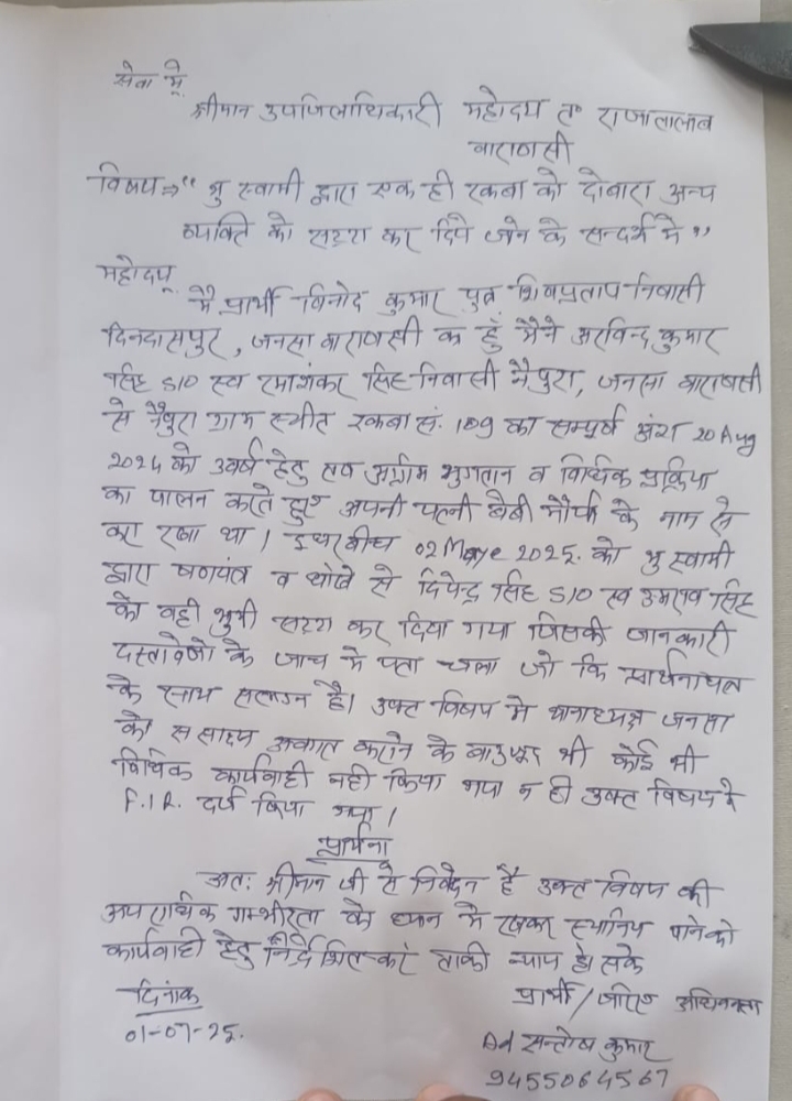 वाराणसी/-जंसा थाना क्षेत्र के एक गाँव मे भू-स्वामी द्वारा एक ही भूमि को दो लोगो को सट्टा करने का मामला प्रकाश में आया है।एसडीएम राजातालाब के यहाँ पहुँच पीड़ित ने प्रार्थना पत्र देते हुए लगाया न्याय की गुहार एफआईआर दर्ज कराने का किया माँग।प्राप्त जानकारी के अनुसार जंसा क्षेत्र के नैपुरा गाँव निवासी अरविंद कुमार सिंह ने बीते 20 अगस्त 2024 को अपने भूमि आराजी नम्बर 109 रकबा 0.192 हेक्टेयर में से अपना सम्पूर्ण वैधानिक अंश 1/12 एकबा 0.016 हेक्टेयर का रजिस्टर्ड सट्टा जंसा क्षेत्र के दीनदासपुर निवासिनी बेबी मौर्या पत्नी विनोद कुमार मौर्या को किया था जिसके बाद पुनः अरविंद कुमार सिंह द्वारा बगैर सट्टा समाप्त कराये आराजी नम्बर 109 सहित आराजी नम्बर 25 व 26 का सट्टा बीते 2 मई 2025 को जंसा के नैपुरा गाँव निवासी दीपेन्द्र प्रताप सिंह को कर दिया है जिसकी जानकारी होने पर सट्टा धारक पीड़ित विनोद कुमार मौर्या ने एसडीएम राजातालाब के यहाँ प्रार्थना पत्र देते हुए न्याय की गुहार लगाने के साथ साथ एक ही भूमि को दो बार दो लोगो को सट्टा करने वाले भू-स्वामी के खिलाफ एफआईआर दर्ज कराने की माँग किया है।वही पीड़ित ने जंसा पुलिस पर गंभीर आरोप लगाते हुए बताया कि प्रार्थना पत्र देने के बाद चौकी प्रभारी कस्बा जंसा आयुष ओझा फोन तक नही उठाते है और तो और हम पीड़ित का नम्बर भी ब्लैक लिस्ट में डाल दिये है।वही इस बाबत कस्बा चौकी प्रभारी जंसा आयुष ओझा का कहना रहा कि विनोद कुमार मौर्या नशे का आदि है शराब का सेवन करने के बाद वह गलत गलत सूचना देता रहता है जिसके कारण पुलिस परेशान होती है और रही बात सट्टा के बाबत मिले प्रार्थना पत्र पर कार्यवाही न करना यह आरोप बेबुनियाद है दो दिन पूर्व विनोद का भाई आया था दोनों सट्टा धारक आपस मे वार्तालाप किये है और कार्यवाही कुछ दिनों के लिए स्थगित करने की बात कहकर गए है प्रथम पक्ष के सट्टा कैंसिलेशन के लिए द्वितीय पक्ष द्वारा प्रार्थना पत्र दिया गया है।