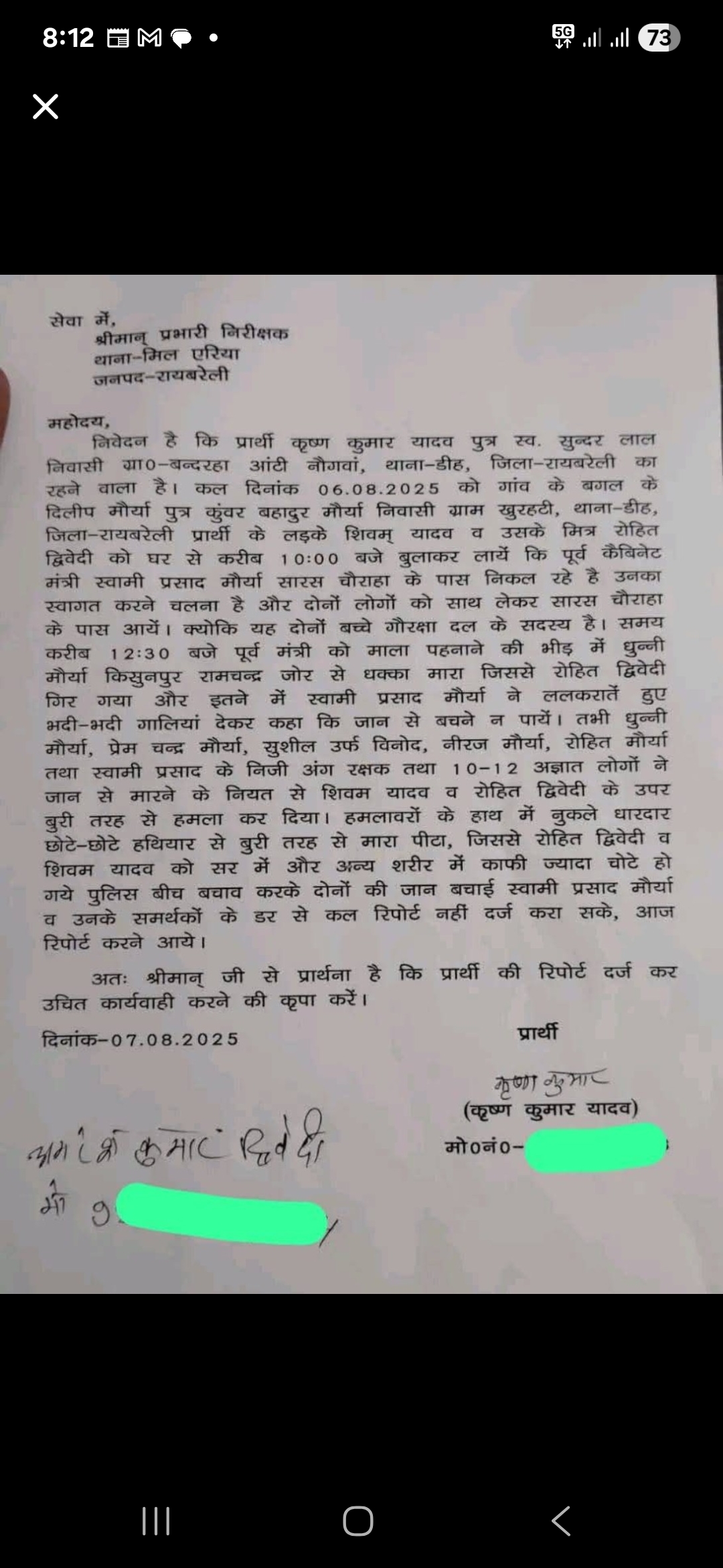 प्रार्थी कृष्ण कुमार यादव, निवासी गांव बंदनरहा आंटी भोजगांव, थाना-डलमऊ, ने आरोप लगाया कि दिनांक 06 अगस्त 2025 को उनके पुत्र शिवम यादव और उनके मित्र रोहित द्विवेदी को स्वामी प्रसाद मौर्य के स्वागत समारोह के दौरान बुलाकर लाया गया। कार्यक्रम स्थल पर कथित रूप से धक्का-मुक्की के बीच उनके ऊपर हमला हुआ जिसमें कई अज्ञात लोग एवं निजी अंगरक्षक शामिल बताए जा रहे हैं।